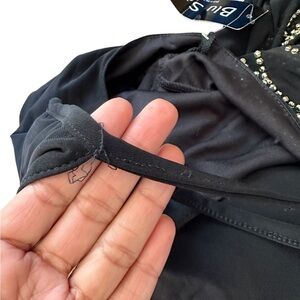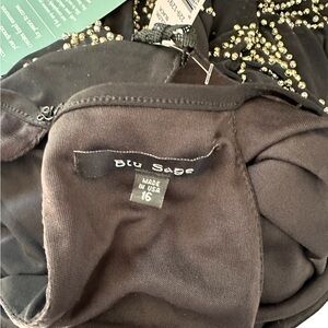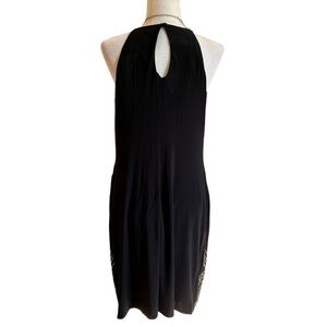 An absolutely beautiful high neckline dress with gold beads on a solid black base on the front and solid black on the back. The dress is fully lined and has a keyhole button closure on the back neckline.
