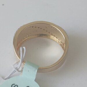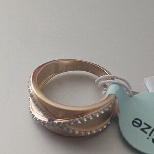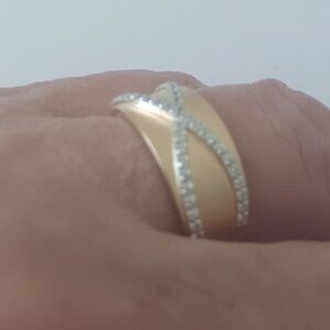 This stunning crossover ring features a luxurious gold band with sparkling silver accents. Perfect for adding a touch of elegance to any outfit.