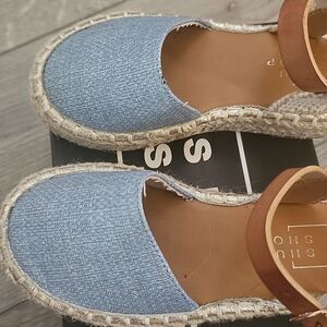 Blue Sandals with Jute Sole and Tan Ankle Strap