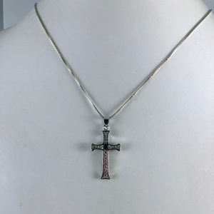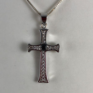 Blue Sapphire & Cubic Zirconia Sculptured Cross set in 925 Solid Sterling Silver with 16 inch Box Chain Necklace 1.25 inch tall 3/4 inch wide new from Gem Emporium