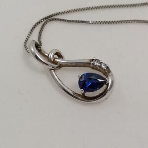 Beautiful blue pear shaped sapphire with 2 small diamond accents. Marked 925 on both chain and pendant in addition to other marks that I could not identify. Total Weight 4.2 grams.