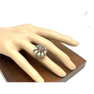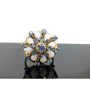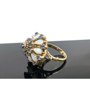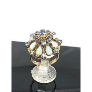 Blue Sapphire White Opal Cocktail Women's Ring 14k Yellow Gold Estate Size 5.5