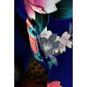 Blue Satin Japanese Kimono Style Floral Peacock Womens M Short Tie Robe