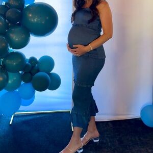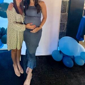 Elegant maternity blue midi dress with ruffle details. Very stretchy wore once to my baby shower. Size Small- I am 5’7” for reference and 34 weeks pregnant in these photos