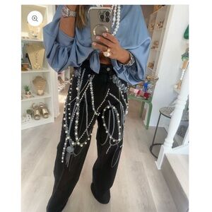 Stylish blue satin top paired with black pants adorned with intricate beadwork.