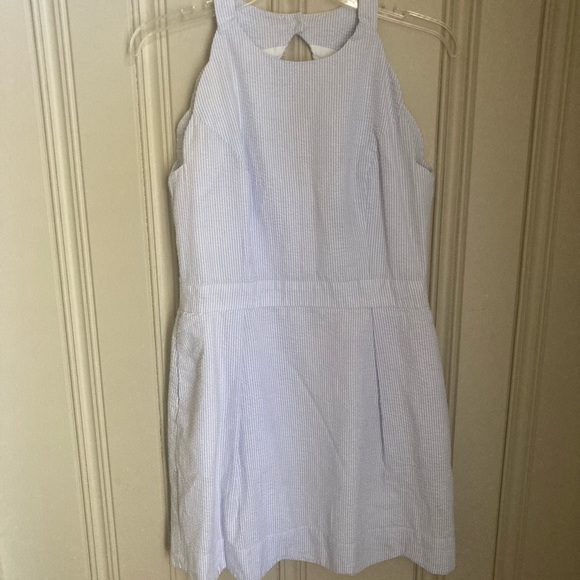 Blue Seersucker, scalloped sleeve. Form fitting. Mid-knee length. Never worn. Excellent condition.