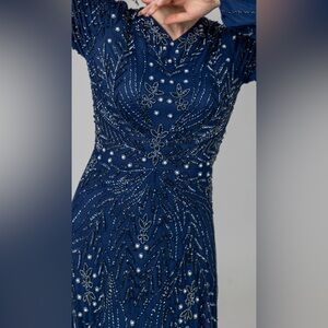 This exquisite blue gown is adorned with shimmering beads and pearls, perfect for a wedding guest or cocktail event. The elegant V-neckline and bishop sleeves add a touch of sophistication. Its floor-length design and fitted waist create a graceful silhouette, ensuring you make a memorable entrance.