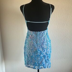 This is the perfect homecoming dress, absolutely stunning!! Backless gorgeous blue sequined bodycon mini dress.
