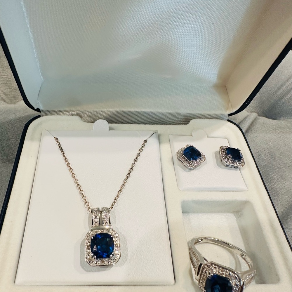 Brand new never been worn, little discoloration on the sterling silver necklace which can be cleaned, other than that the three piece set is beautifully crafted with diamonds and blue stones .
