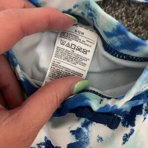 Long sleeve rash guard with blue shark print. Matching blue tie-dye swim shorts.