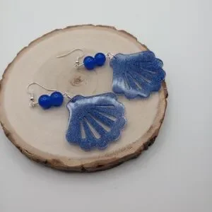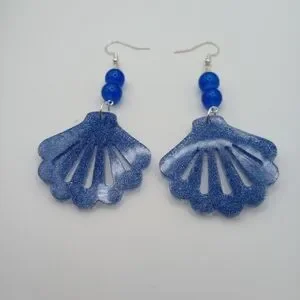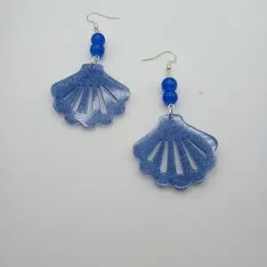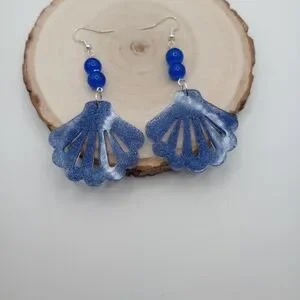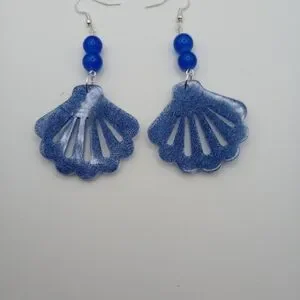 Elegant blue shell earrings perfect for any occasion. Add a touch of ocean-inspired style to your outfit. The earrings are made with glass blue beads and silver ear wire.