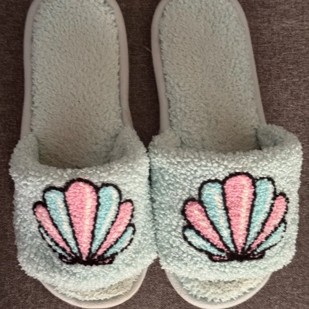 Cozy slippers with shell design. Features pink and black accents. Size M/L, fits a 9/10