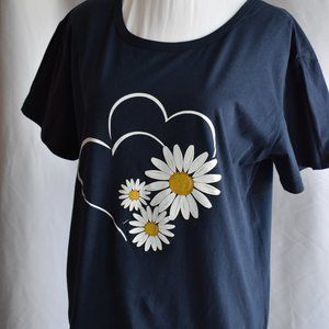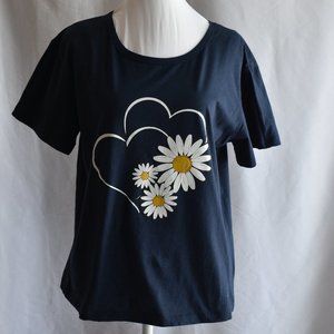 Like new, large, navy blue graphic tee with hearts and flowers. Very cute!
