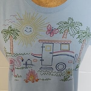 This blue short sleeve tee showcases a whimsical retro camper graphic, set against a beachy backdrop with palm trees and a sun. The relaxed fit and classic crew neck make it perfect for a casual, summery vibe.
