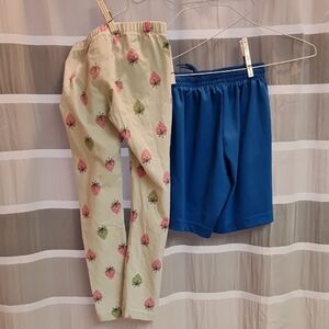 Lot of 2 - Set includes blue shorts and cream leggings with strawberry print. Comfortable and stylish for kids. Shorts are probably a 5/6 but could not find a tag.