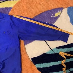 Very cool artistic beautiful blue 100% silk button down. Has an artistic subtle dye job, bottom half slightly darker. Missing a couple of buttons but not noticeable at all. Size M but fits S-L depending on desired fit.