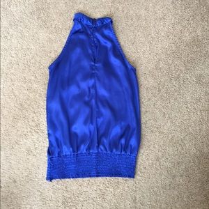 This cute royal blue halter top is silky to the touch, has ruffles in the front and buttons on the back of the neck for a easy fit. There’s no flaws.