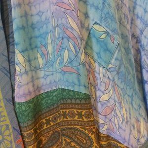 Kimono style robe with tie belt. Very silky drape and feel, but unknown fabric content. Rich colors - mostly teal and turquoise with some purple and olive in the pattern. There is one small, expertly done patch about 2" above the belt on the left front. Length 42" width (pit to pit) 28"