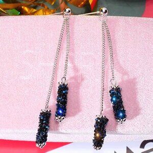 Blue Silver Crystal Tube Edgy Lightweight Drop Silver Chain Earrings
