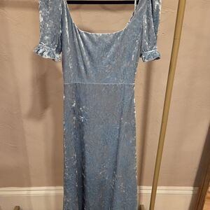 Blue Silver Velvet Sheath Maxi Dress with Puff Cap Sleeves