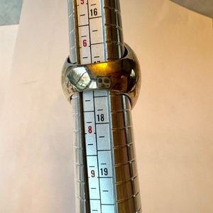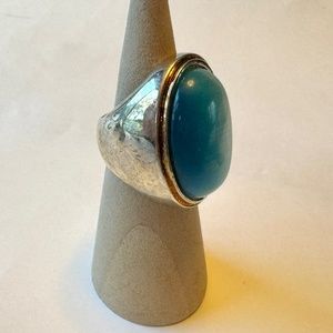 VGUC. This ring is approx. size 7; please see the photo with the ring mandrel. This ring is not adjustable. It has a blue oval cabochon inset and I'm not sure if it's acrylic or glass. The silver-tone metal finish shows some wear, so please zoom in to examine the photos. I have not tried to polish or deep clean this ring.