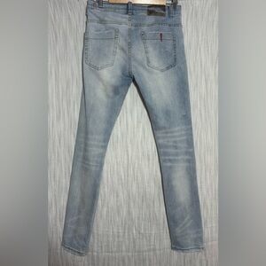 These blue skinny jeans feature a trendy distressed design with substantial horizontal rips across the thighs and knees. The light to medium blue wash, combined with natural fading and whiskering, gives them a vintage, worn-in look. Perfect for adding an edgy touch to your casual wardrobe. 849