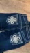 These blue skinny jeans feature a smooth and uniform denim texture with distinctive white decorative stitching that forms an ornate design on the back. The rich indigo color suggests they are well-maintained, making them a stylish addition to any outfit. Cross bedazzled design on pocket. Jewels and rhinestones