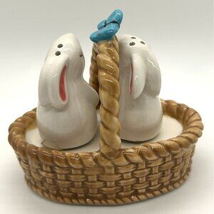 Blue Sky Bunny Salt & Pepper Shakers In Basket With Floral & Blue Butterfly