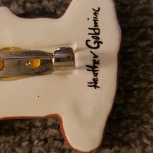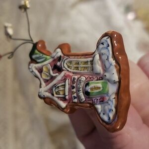 Blue Sky Clayworks Christmas Cookie House Pin and Snowman pin From 2003 designed by Heather Goldminc. Condition is EXCELLENT. No flaws. Snowman has bendable arms. Both are collectors pins. Both pins are 3" tall . Gingerbreadhouse is 3" plus wires with stars.