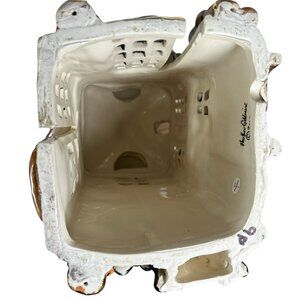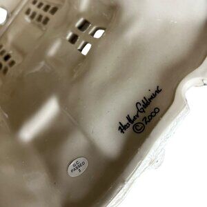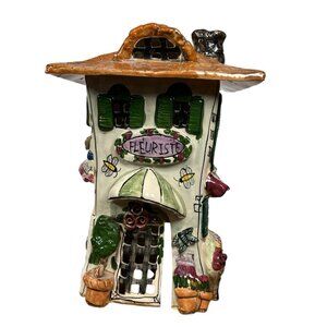 The Blue Sky Clayworks Heather Goldminc Cafe Chapeaux Fleuriste Tealight House 2000 is a charming candle holder made of ceramic, featuring a multicolor glazed finish. This hand-painted piece is designed in a country style with a whimsical theme inspired by seasonal fairy tales and novelty. With a 3D effect and a cottage subject, this retired collectible from 2000 is perfect for all occasions and adds a touch of magic to any decor.