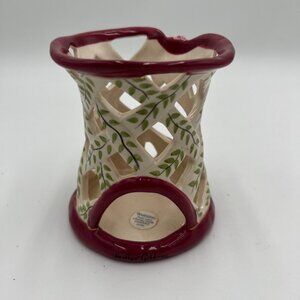 A beautiful and vibrant tealite holder from Blue Sky Clayworks, designed by Heather Goldminc. Featuring a playful cat amidst blooming flowers, this piece is dated back to 2004. A perfect addition to any cat lover's collection! Vintage