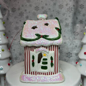 *Hand Painted - White Iridescent Glitter "Snow Covered" Roof & Around The House -Adorable Wreath On Front Of House - Christmas Trees Peeking Out From The Windows