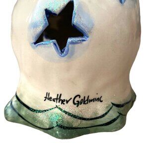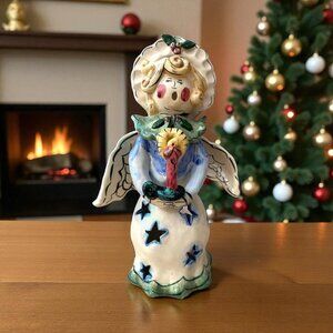 Add a heavenly glow to your holiday décor with this charming Blue Sky Heather Goldminc angel tea light holder. Dated 2001, this hand-painted ceramic angel holds a glowing candle and features beautiful holly berry accents, star-shaped cutouts, and whimsical detailing. Perfect for Christmas displays, mantle décor, or as part of a Blue Sky collectible set.