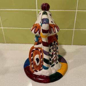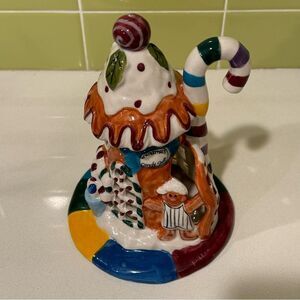 Charming gingerbread house. Features a candy cane chimney and gingerbread figure. Perfect for holiday decor.