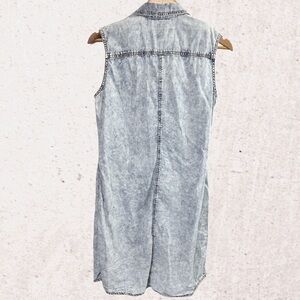 This casual blue dress combines the classic appeal of a shirt with the relaxed vibe of a sleeveless design. Crafted from light-washed denim, it features a notched collar that adds a touch of sophistication to its laid-back style. Ideal for everyday wear, this dress offers a comfortable and stylish option for any casual occasion.
