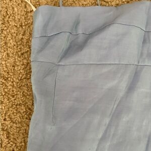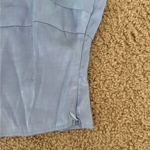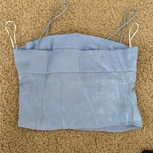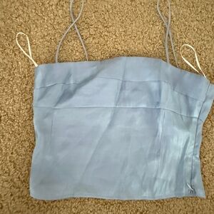 This fitted blue camisole features a sleek, sleeveless design with delicate spaghetti straps. Its cropped length and luxurious satin-like fabric offer a chic and modern look, perfect for elevating any outfit. Small hole shown above