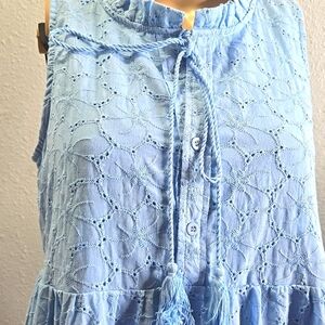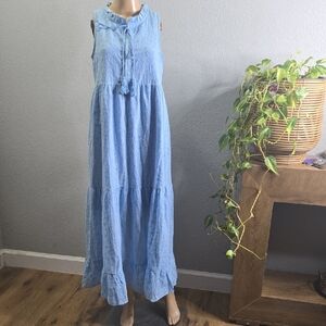 This elegant blue sundress features a sleeveless design with a chic mock neck and a flowing maxi length, perfect for casual or resort wear. The mandarin collar adds a touch of sophistication, making it a versatile piece for any relaxed occasion.