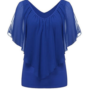 This fabulous NWT sexy V neck off shoulder top quality blouse is perfect with jeans, slacks, and skirts for either dress or casual wear. Beautiful quality. Soft and pretty poly blend chiffon. Very soft. Very stretchy. True sizing. Order your usual size. See measurements in comments below. Stretchy, solid base with sheer top layer. We ship fast, offer bundle discounts, and include a FREE NWT gift with each order! This listing is for brilliant blue. See black in separate listing. T5 G3