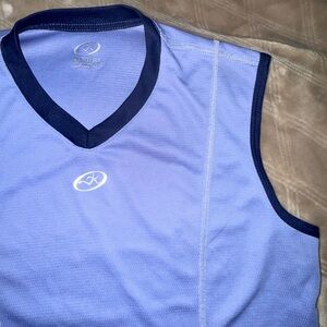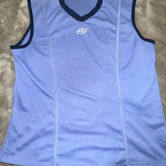 Vintage Workout Tank. Stay cool and stylish with this blue mesh like sleeveless tank top. Perfect for casual outings or workouts. Dark blue pocket on the back for biking 🚴. Fair Condition. Pulling pictured.