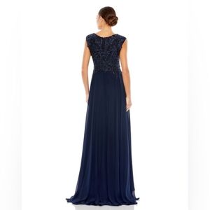 This elegant blue gown features a sleeveless design with a flattering V-neckline, perfect for prom or formal occasions. The dress flows into a full-length skirt, exuding sophistication and grace.