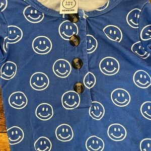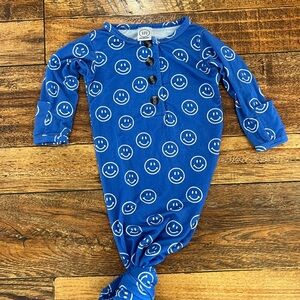 Adorable blue knotted gown with smiley face pattern. Perfect for a cozy and cheerful look. Newborn. By LouLou from baby boutique.