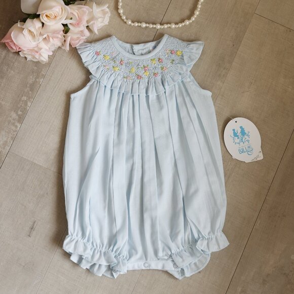 This Little Romper by Luli & Me is just precious. Done in a pale blue with a touch of aqua, a gorgeous hue! The cotton blend romper has a bishop style neckline trimmed in a matching ruffled hem, creating a petite flutter sleeve. The smocking is done with a lattice design embroidery in light blue. Embroidered flowers in shades of blue, pink and yellow adorn the smocking. The leaves are done in a green threading. The back of the neckline mirrors the front embroidery design. The romper falls into soft gathers beneath the smocking. The back has a button closure done with sweet pearlized buttons with Luli's signature imprint. A three snap inseam makes for easy changes. Super little sweet romper/bubble to keep you baby girl cool in the warm summer months. NWT- perfect condition!