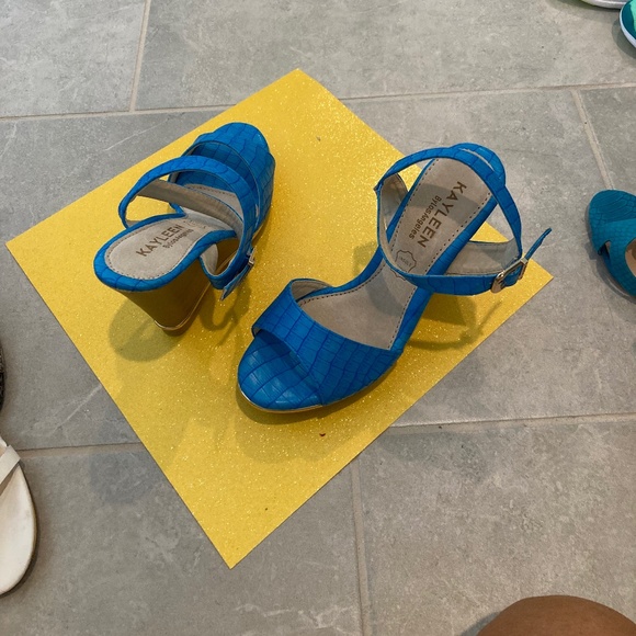 Size 6 1/2 Blue Sandals snake designed high wedge heels with strip of gold at bottom of heel and new never worn. Celey Elegant Boutique