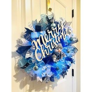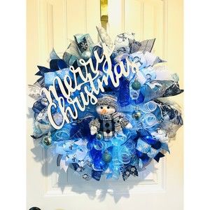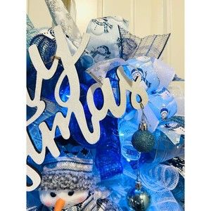 Blue Snowman Merry Christmas Ribbon Door Wreath Handmade 22 ins LED W23