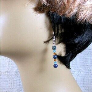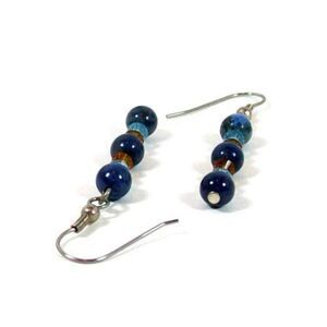 These lovely beaded earrings hang slightly over 2 inches long from the top of the surgical steel french hook to the bottom of the last sodalite bead. These crystal earrings feature 3 sodalite beads with amber and light blue fire polished crystal beads accenting them. You will love how lightweight and comfortable these blue dangle earrings are.