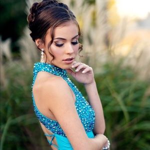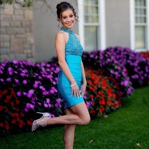 This Sherri Hill dress is very flattering and in perfect condition. It has stretchy material. The back has a zipper and laces up. It was worn once. Perfect for any special event. The pictures attached are actually of me when I modeled it one time!