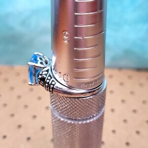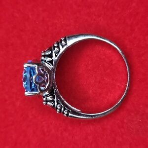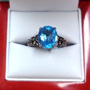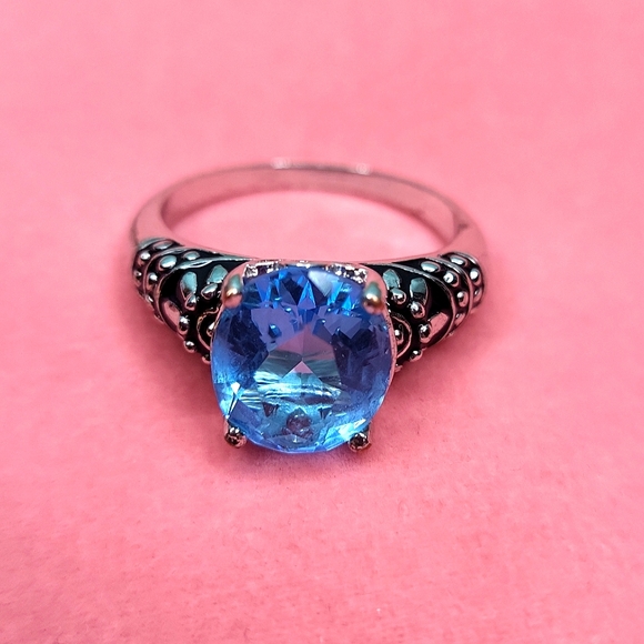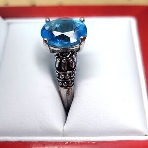 Silver tone with black enamel accent. Classic design with stunning colors and comfortable to wear. Oval-shaped blue stone with cushion cut. Fabulous cocktail ring to add to your collection!