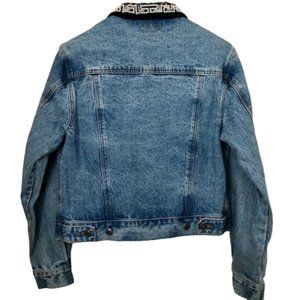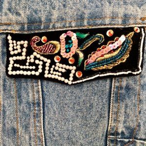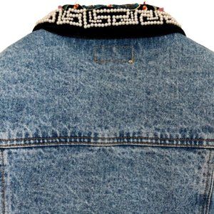 When you want to wear jeans, but need a little bling to brighten the day! This gorgeous jeans jacket has a jeweled collar and front breast pocket plackets. Jewels include pearls, beads, sequins, and gold embroidery. The jewels are sewn on, and none are missing.