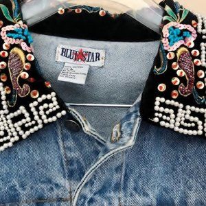 Blue Star Embellished Denim Jacket Pearls Sequins - L