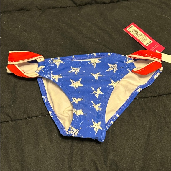 NWT Blue bikini bottom with white star pattern and red accents. Perfect for a stylish beach day.